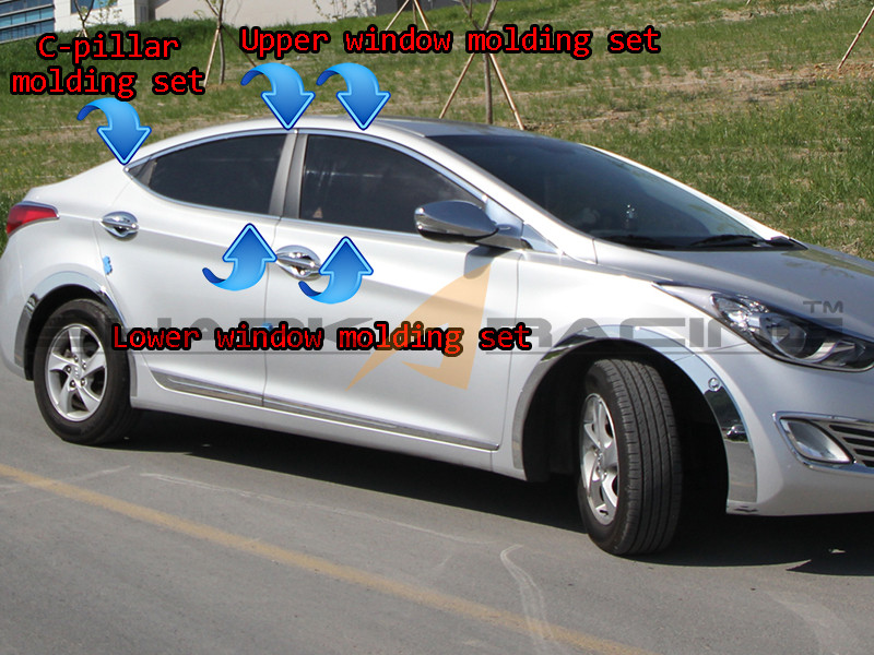 Complete set composed of upper and lower window moldings, and C-pillar moldings.