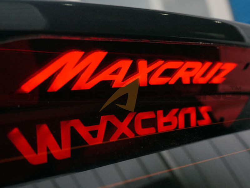 Brake light logo panel is made of a thin acrylic sheet that has been cut to the size of the factory spoiler brake light, with all but the lettering blocked off. So when you press the brake pedal, you can see the logo through the acrylic.