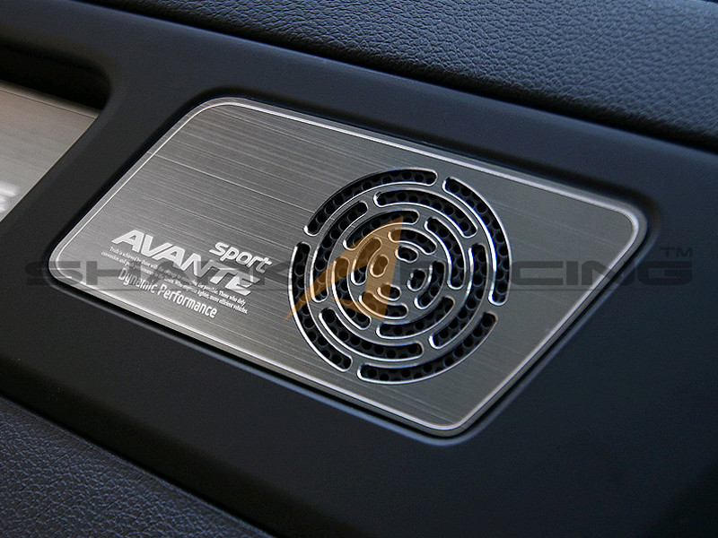 Brushed Aluminum Speaker Grill Overlay kit goes over the front door speakers, for the 2017+ Elantra and Elantra Sport.